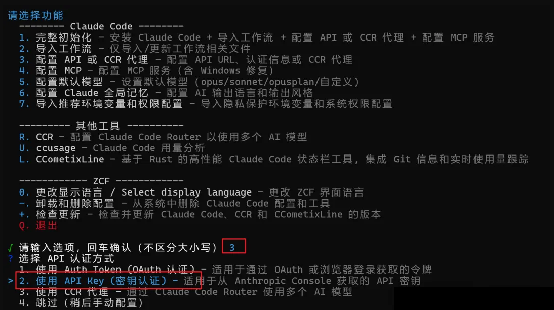 根据选项,选择“3、配置API或CCR代理” ,并进入下一个选项。