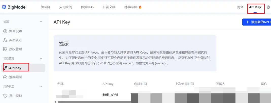 进入界面 https://www.bigmodel.cn/usercenter/proj-mgmt/apikeys申请API KEY。